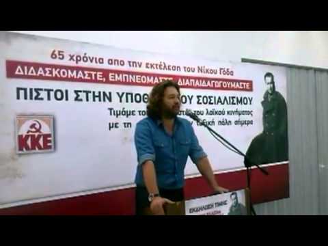 Επίσης, μεταξύ άλλων, πρόσθεσε: «Θέλουμε να επισημάνουμε πως με αυτή την εκδήλωση το ΚΚΕ δεν κάνει παντός είδους μνημόσυνο αποκομμένο από το σήμερα, τις σημερινές εξελίξεις, την πραγματικότητα που ζούμε. Δεν θέλουμε να μιλήσουμε για κάποιες άλλες ηρωικές εποχές, να περιγράψουμε τελικά περίπου ως μεταφυσική, ανεξήγητη ή απλώς ρομαντική την πορεία, τις επιλογές των αγωνιστών, των κομμουνιστών τότε. Αντίθετα: Εμπνεόμαστε, διδασκόμαστε, διαπαιδαγωγούμαστε, τιμούμε τους νεκρούς μας και σφίγγουμε το χέρι μπροστά στη σκληρή πάλη που διεξάγουμε σήμερα».